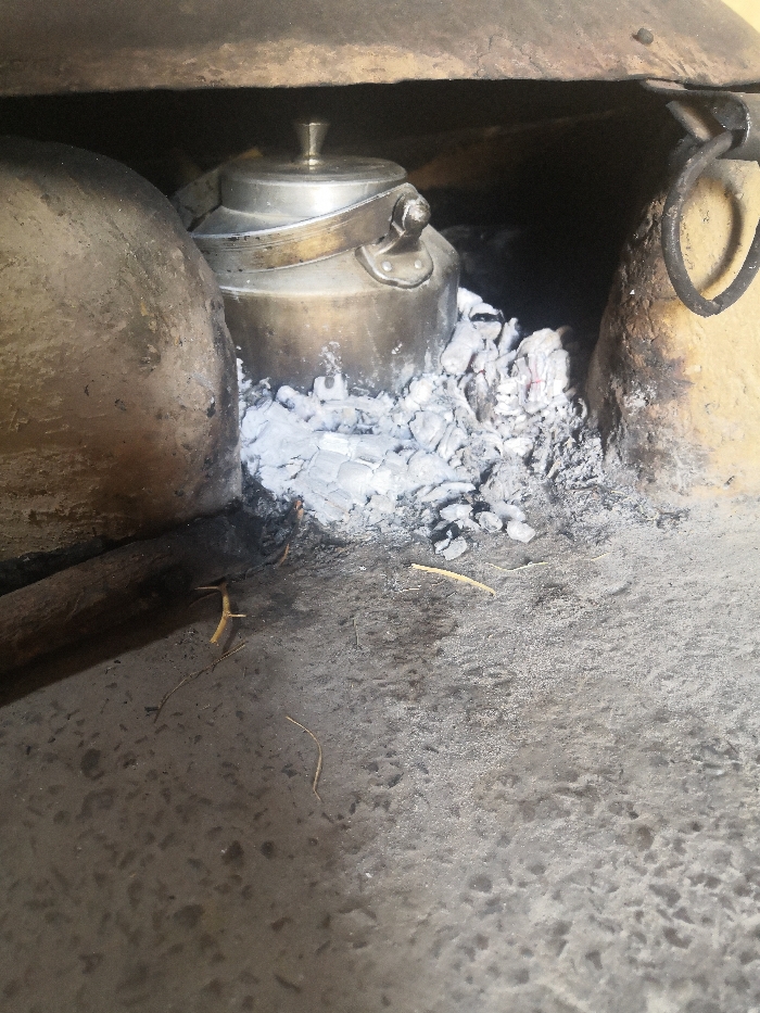 The image displays a close-up, ground-level view of a traditional cooking area within a structure in Akhundzadakhail, Pakistan