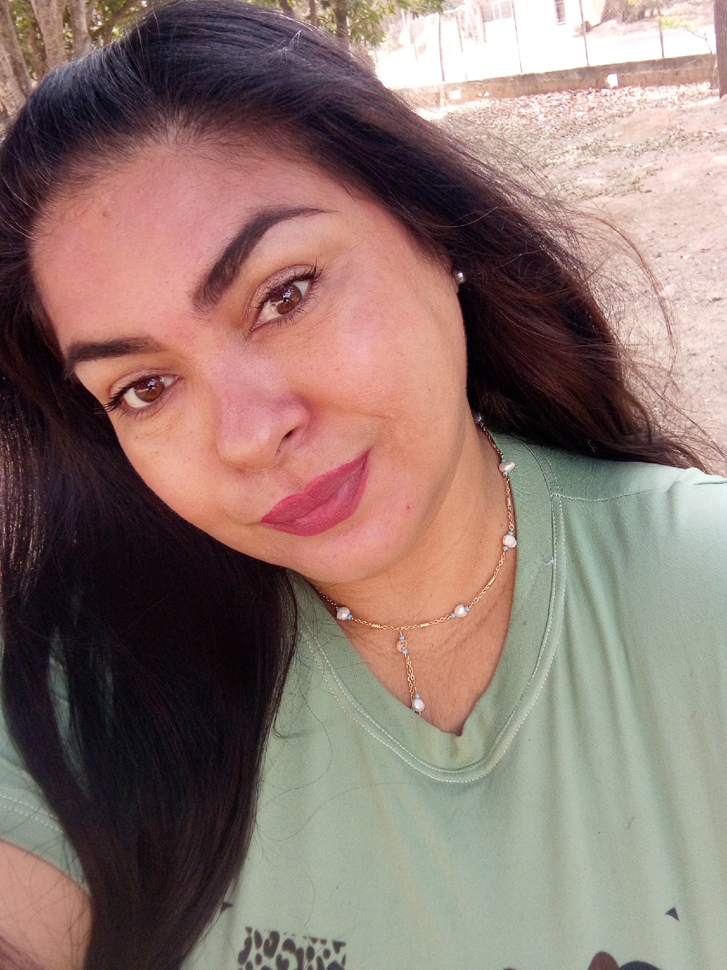 A woman with dark hair and brown eyes is the main subject of the image. She has a fair complexion and is wearing lipstick. She is wearing a light green shirt and a gold necklace with pearls. The background is slightly blurred, but it appears to be an outdoor setting, possibly a park or residential area. The location is Las Piedras, Venezuela.
