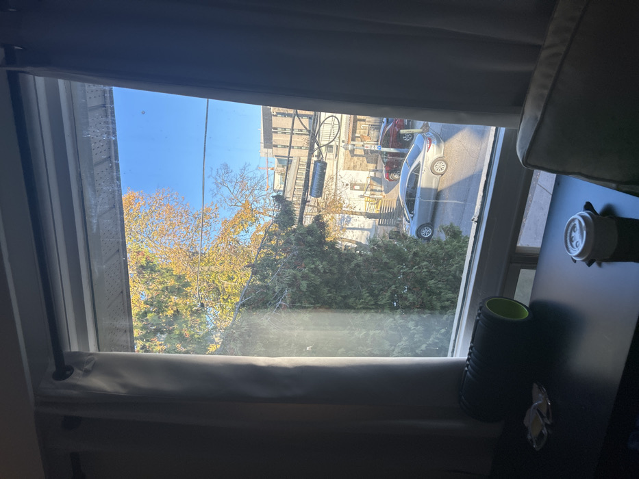 The image displays a daytime view from inside a room looking out a window onto a street in Kingston, Canada, specifically in an area consistent with the vicinity of Queen's University. **Inside the Window (Foreground):** The lower portion of the image shows a dark, flat surface, likely a desk or window sill. On this surface, from left to right, are a black foam roller with a green interior, two small crinkled metallic objects, and a white disposable coffee cup with a lid, sitting on a dark coaster. A light-colored upholstered furniture piece is partially visible on the far right. The window is framed by light grey curtains on a black rod, with strong sunlight casting reflections and shadows on the glass and interior objects. **Outside the Window (Midground and Background):** The exterior scene reveals a street with a grey asphalt surface. A silver sedan is parked on the street, facing right, with its front end partially out of frame. Behind it, a darker red SUV is also parked. A utility pole with multiple overhead wires and a black cylindrical component is visible near the parked vehicles. A blue and white street sign is attached to the pole. To the left, a large deciduous tree displays vibrant yellow and orange autumn foliage, with a dense green evergreen shrub below it. In the distance, a multi-story, light-colored building with numerous windows, characteristic of institutional architecture, is visible, with faint construction cranes above it, indicating development. The sky is clear blue. No people are visible.