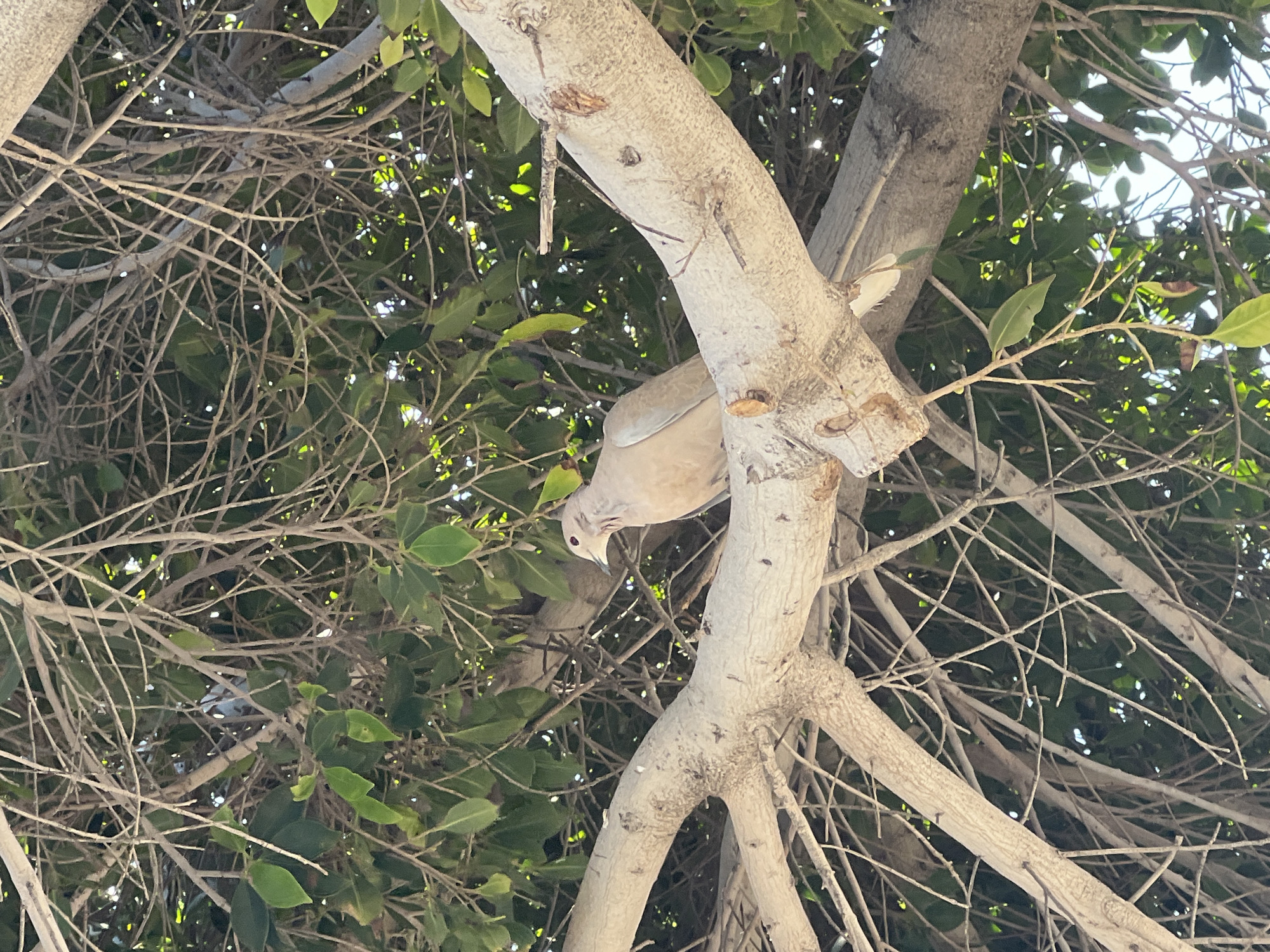 A single Eurasian collared dove (Streptopelia decaocto) is perched on a thick, light-colored tree branch within the city of La Unión, Spain. The bird, positioned in the central-right of the frame, faces left with its head slightly turned, exhibiting light beige plumage and a dark eye. The branch supporting the bird is robust, horizontally oriented, and covered in textured, light grey bark. The surrounding environment consists of a dense tree canopy, characterized by numerous slender, bare branches interlaced with green leaves. Dappled sunlight filters through the foliage, creating varying light conditions across the scene. No other subjects or interactions are visible.