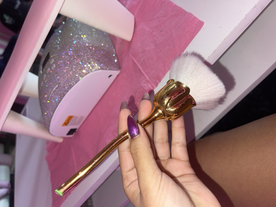 The scene depicts an interior view in the city of Altagracia, Venezuela, focusing on a workstation. A person's hand, featuring manicured fingernails with purple glitter polish on the thumb and ring finger and clear extensions on other digits, is holding a gold-colored dusting brush. The brush handle includes a stylized floral design at the base of its white bristles and a cylindrical gold shaft with a green tip. This hand is positioned above a white table, which is partially covered by a pink, crinkled protective sheet. On this sheet, a white UV/LED nail lamp, heavily encrusted with silver rhinestones across its curved upper surface and displaying an orange warning label on its side, is present. A segment of a light pink fixture is visible in the upper background. The lower left foreground reveals a portion of the person's bare leg.