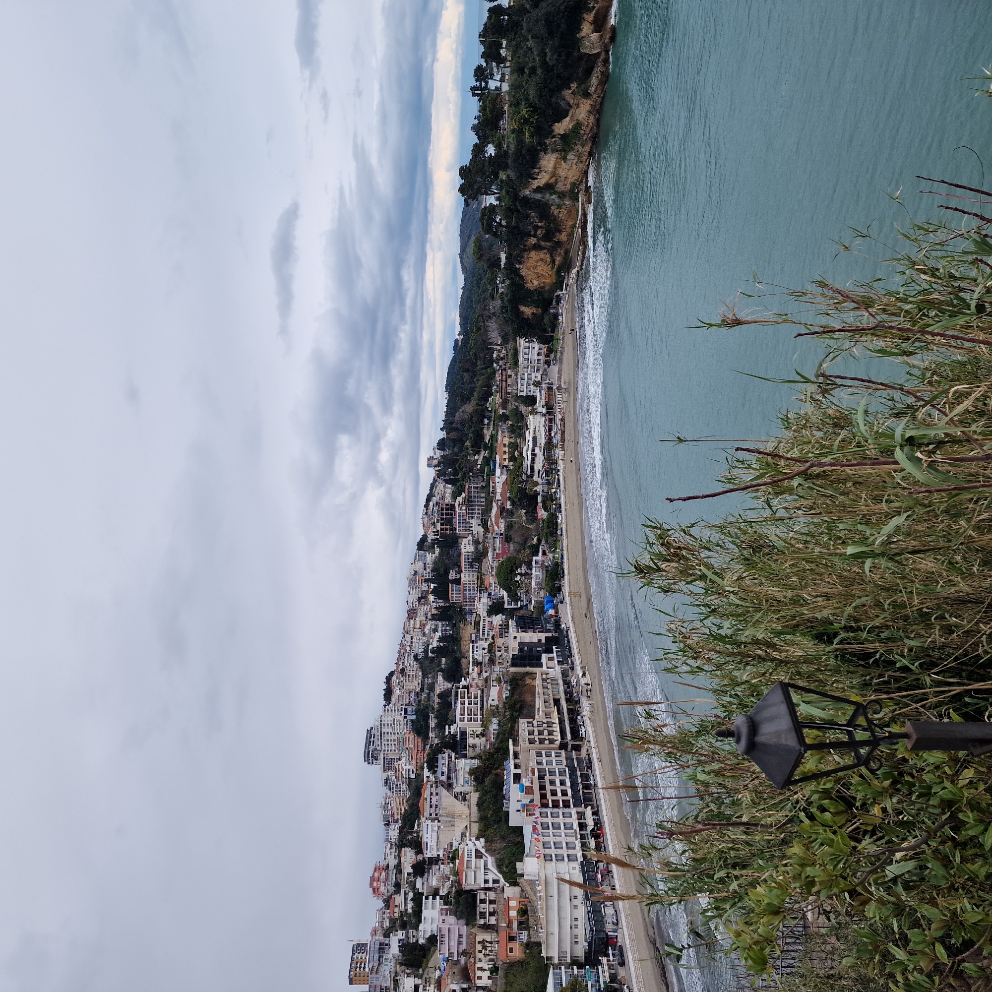 The image presents an elevated panoramic view of the Mala Plaža (Small Beach) bay in Ulcinj - Ulqin, Montenegro, under an overcast sky. The upper half of the frame is dominated by a uniform light grey cloud cover, indicating an overcast condition. The sea, in the mid-ground and lower right, exhibits a turquoise to greenish-blue coloration with noticeable wave activity breaking along the sandy shoreline. The crescent-shaped beach extends horizontally across the central mid-ground. Along the immediate beachfront, a series of multi-story buildings are visible, including hotels and commercial establishments, characterized by light-colored facades, balconies, and ground-level storefronts. One prominent building displays a vertical array of international flags. Vehicles are discernible parked along the road that parallels the beach. Behind these beachfront structures, the urban landscape of Ulcinj ascends the hillside, featuring numerous residential and commercial buildings densely arranged on the slopes. These structures are predominantly white or pastel-colored, many with red-tiled roofs, blending into the green vegetation. To the right of the bay, a prominent rocky cliff, heavily vegetated with dark green trees and shrubs, forms a natural barrier, extending into the sea. A small, flat concrete structure is visible at the base of this cliff, adjacent to the beach. In the immediate foreground, a dense cluster of tall, light green reeds and broad-leafed plants partially obscures the lower portion of the scene. A dark, traditional-style street lamp with a square lantern top is prominently positioned in the lower-left foreground, partially encompassed by this vegetation. A faint dark metal fence or railing is discernible behind the foreground foliage to the left. A small group of indistinct human figures is visible on the beach near the water's edge; their specific actions or interactions cannot be determined due to distance. The overall scene is illuminated by soft, diffused natural light, consistent with the overcast weather.
