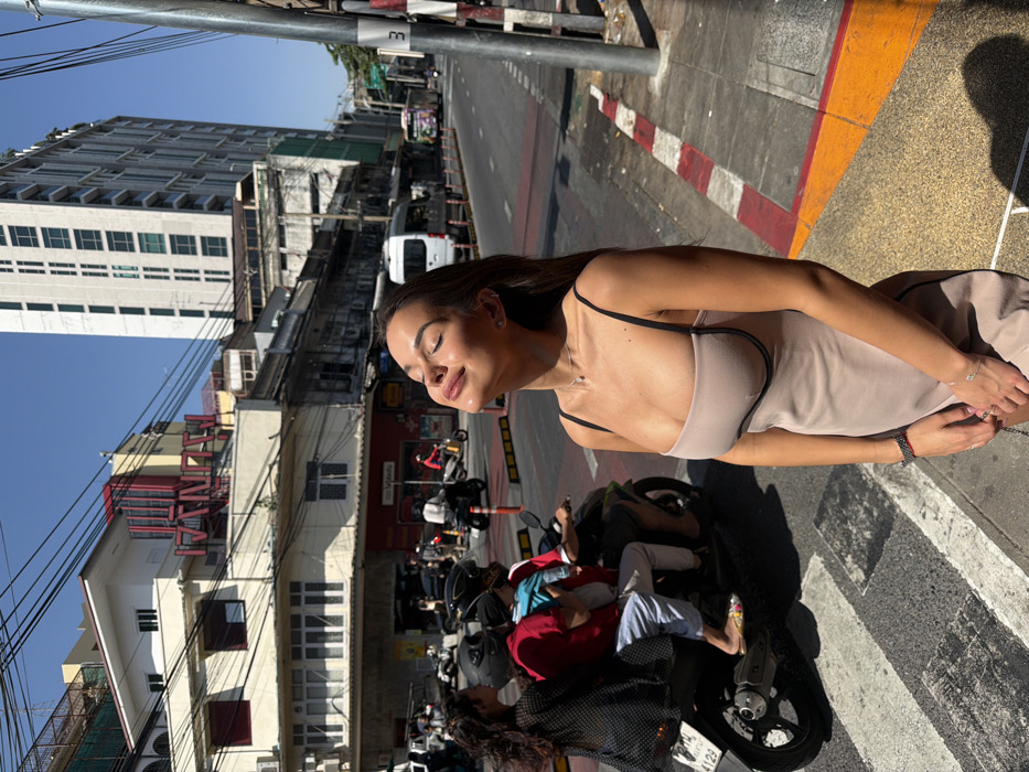 A woman in a light brown dress stands on a city street, eyes closed and face tilted towards the sun. Motorcycles are parked nearby. Behind her, buildings of varying heights line the street. Overhead power lines crisscross in front of a multi-story structure. A traffic pole displays the number "3". The edge of the sidewalk shows yellow and red markings.