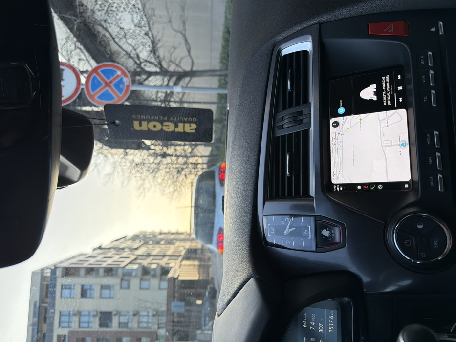 The image depicts a driver's perspective from within a vehicle, looking forward through the windshield at a street scene in Plovdiv, Bulgaria. The time of day appears to be late afternoon or early evening due to the low sun angle and warm light. In the foreground, the vehicle's dark gray dashboard is visible. On the left, a digital instrument cluster displays "64 km/h," "7.4 l/100 km," "307 km," and "1517.6 km." The center console features an analog clock set to approximately 3:45, a "START STOP" button, and air vents. An infotainment screen displays a map on the left side, showing streets with Cyrillic names, and a music player on the right, currently playing "INZZIATTA - POVECHE (OFFICIAL VISUALIZER)" by "RIZZIATTA." Below the screen are control buttons labeled "DRIVE," "NAV," "MEDIA," "TEL," "WEB," and "SETUP." A red hazard light button is visible on the far right. A black "AREON QUALITY PERFUMES" air freshener hangs from the rearview mirror assembly. Through the windshield, a light-colored sedan is visible directly ahead, with its red brake lights illuminated, suggesting it is stopped or slowing down. To the right of the sedan, two red-and-white road signs are posted on a pole: a circular sign with a red border and white background (partially obscured) and a circular sign with a red border, blue background, and a red diagonal cross, indicating "No Stopping/Standing." Bare deciduous trees line the right side of the street. In the background, multi-story residential buildings with light-colored facades and numerous balconies line both sides of the street. The sun is low in the sky, creating a soft, warm glow. The map displayed on the infotainment screen indicates the vehicle's position is on or near the intersection of Улица Найчо Цанов (Naicho Tsanov Street) and Улица Апостол Карамитев (Apostol Karamitev Street) in Plovdiv, Bulgaria, specifically in a developed residential area.