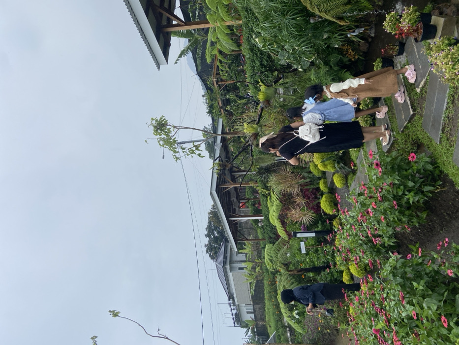 The image displays an outdoor garden or recreational area situated in Trawas, Indonesia, under an overcast sky