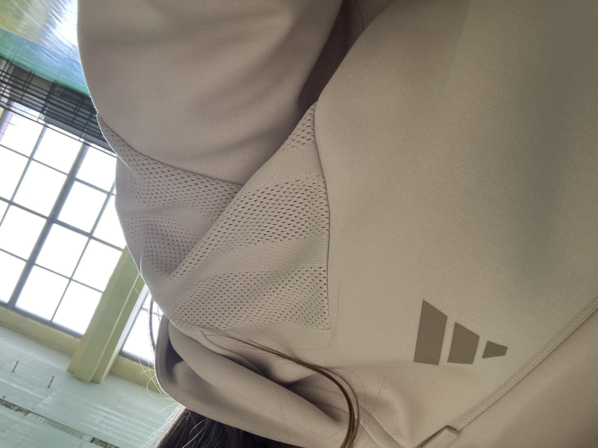 The image displays a close-up, over-the-shoulder perspective of an individual, likely female, from the back or side, situated within an indoor facility. The subject is wearing a light beige or pale pink hooded sweatshirt. A prominent, darker beige Adidas logo, characterized by three ascending parallel bars, is visible on the upper left chest/shoulder area of the garment. The sweatshirt also features a distinct mesh-like, perforated textile panel integrated into the upper left sleeve and shoulder. Strands of long, brown hair are draped across the subject's shoulder and the hoodie. In the background, a large window structure composed of multiple panes allows bright natural light to enter, illuminating the scene. Above the windows, a ceiling with green-painted structural elements and a lighter surface is discernible. Below the windows, a dark-colored railing system is present, and the floor is partially visible, covered with a multi-colored mat, primarily green and yellow, consistent with a sports hall or gymnasium. This scene is located in Tutrakan, Bulgaria.