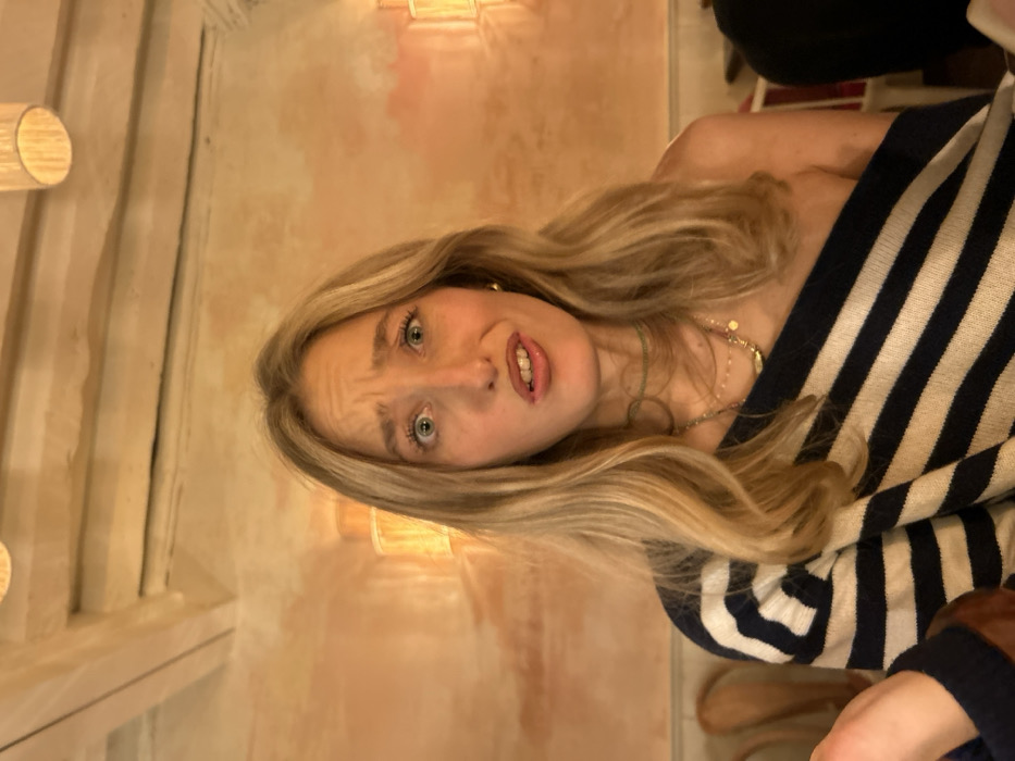 A young adult female is depicted in a medium close-up, positioned centrally and looking directly at the viewer with an expression of surprise or disbelief. Her eyebrows are raised and furrowed, eyes wide, and mouth slightly agape, revealing some upper teeth. She has long, wavy blonde hair. Her attire consists of an off-the-shoulder sweater featuring navy blue and cream horizontal stripes. Adorning her neck are multiple layered necklaces, including a thin green choker, a longer chain with a small gold-colored disc pendant, and another with a gold-colored leaf-shaped pendant. A small gold-colored stud earring is visible in her right ear. The partially visible left hand, belonging to the subject, rests in the lower left quadrant. The background features a warm, textured peach-colored wall illuminated by multiple cylindrical wall sconces emitting a soft, ambient light. The ceiling exhibits exposed wooden beams. A portion of a wooden chair back is visible on the left. The scene is set indoors, consistent with a restaurant or cafe environment. No specific identifying landmarks or features are present within the image to pinpoint its precise location within Paris, France.