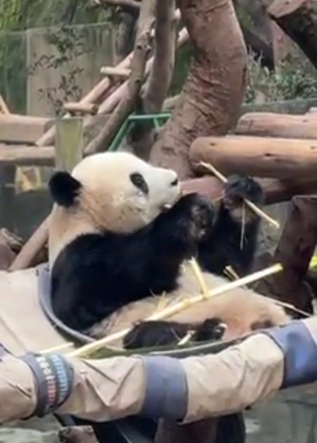 - "A panda is sitting in a hammock-like apparatus, eating bamboo" by FM-K0Kp62, licensed under CC BY 4.0