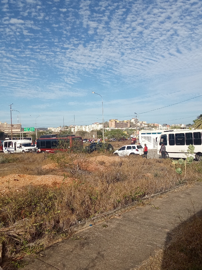 The image displays an outdoor scene in Porlamar, Venezuela, under a bright blue sky partially covered by scattered altocumulus clouds. The foreground consists of dry, unkempt reddish-brown vegetation and exposed dirt, with a segment of weathered asphalt or concrete pavement visible along the lower right edge. In the midground, a multi-lane roadway is populated with several vehicles. A dark red commuter bus is positioned centrally, facing left. To its right, a white minibus is also oriented left. Between these two vehicles, a white SUV or hatchback is present, angled slightly left. A dark-colored vehicle is partially obscured behind the white SUV. On the far left, another white minibus or van is visible in the distance. Three individuals are identifiable near the white minibus. One person wearing a red shirt is standing adjacent to the driver's side of the white SUV. Two other individuals are positioned near the passenger side of the white minibus, appearing stationary. Further in the background, to the left of the white minibus, a group of people is visible near a white building with a distinctive gate. The background is dominated by an urban cityscape featuring numerous multi-story buildings of various designs and colors, extending towards distant, low-lying hills. Multiple utility poles and streetlights are interspersed along the roadway. A green overhead road sign structure is visible on the far left. The vehicles and individuals suggest a dynamic public space, potentially experiencing traffic activity.