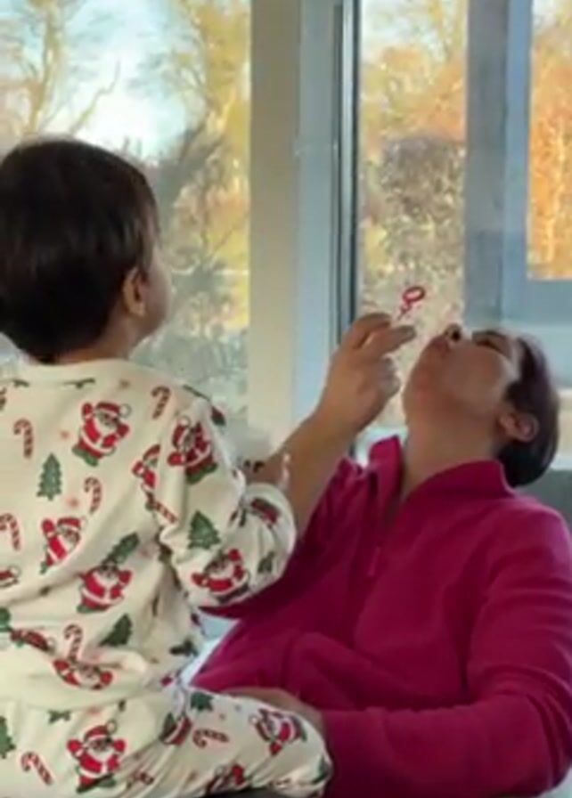 A child wearing Christmas-themed pajamas sits on a table next to a woman in a pink fleece jacket, blowing bubbles for her