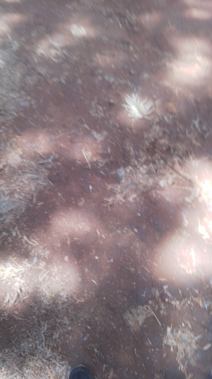 The image presents a blurry, ground-level scene located in Kikuyu Township ward, Kenya. The surface consists of reddish-brown soil with scattered dry organic matter, including small twigs and dried plant fragments. A singular, light-colored, feather-like object is visible on the ground in the upper right portion of the frame. In the lower-left corner, the toe area of a dark-colored shoe is partially discernible, indicating the presence of an individual. Dappled sunlight creates varied light and shadow patterns across the environment. No other persons, specific actions, or interactions are identifiable.