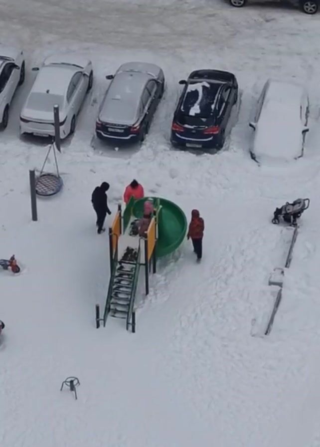 high-angle view of a snow-covered playground located amidst parked cars. There are four cars fully or partially visible, all covered in snow. In the center of the frame is a playground structure consisting of a short metal ladder leading to a green circular slide. Three individuals are present in the playground area. One person, dressed in a black coat, is standing near the base of the ladder. Another person, wearing a red jacket, is walking around the circular slide. It appears there is a child at the top of the ladder. The playground and surrounding area are blanketed with fresh snow, with footprints visible in the snow around the playground. Additional playground equipment, including a swing set and a see-saw, can be seen partially buried in the snow. A stroller sits nearby, also covered in snow. The overall impression is a quiet, snowy scene with limited activity.