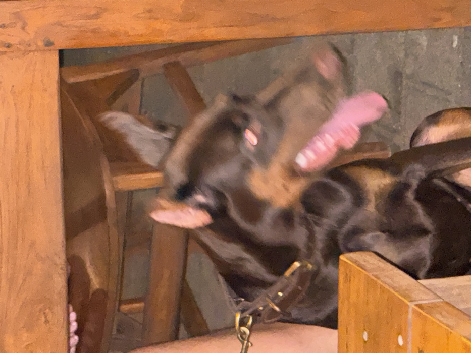 The image depicts a Doberman Pinscher dog in an indoor or sheltered outdoor setting within Canggu, Indonesia. The dog, dark brown with tan markings, is positioned beneath wooden furniture. Its cropped ears are erect, and its eyes exhibit a distinct red-eye effect. A pink tongue is visibly extended from its mouth, appearing blurred, indicating motion. A brown leather collar with a gold-colored snap hook from a leash is secured around its neck, adjacent to a light-skinned human leg visible on the left side of the frame. The dog is surrounded by various wooden elements, including the legs and crossbeams of chairs and a table, all displaying a warm, reddish-brown hue. A light-colored wooden table edge is visible in the lower left foreground. The background is dark and indistinct, revealing a dark floor surface. The scene is characterized by low ambient light, with the red-eye effect suggesting flash photography.