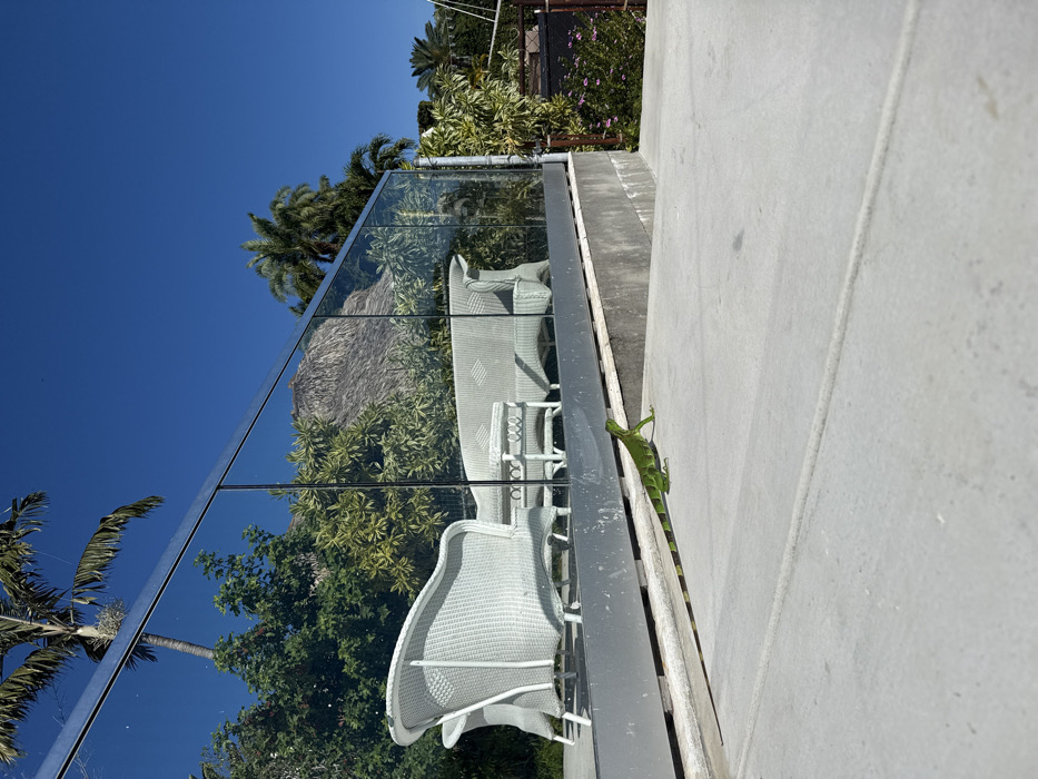 A green iguana clings to a concrete ledge next to a glass panel. The panel reflects a tropical scene of palm trees, lush vegetation, and a hut with a thatched roof. White wicker furniture sits behind the glass. The sky is a clear blue above the trees. The concrete ledge appears weathered and runs along the base of the glass barrier.