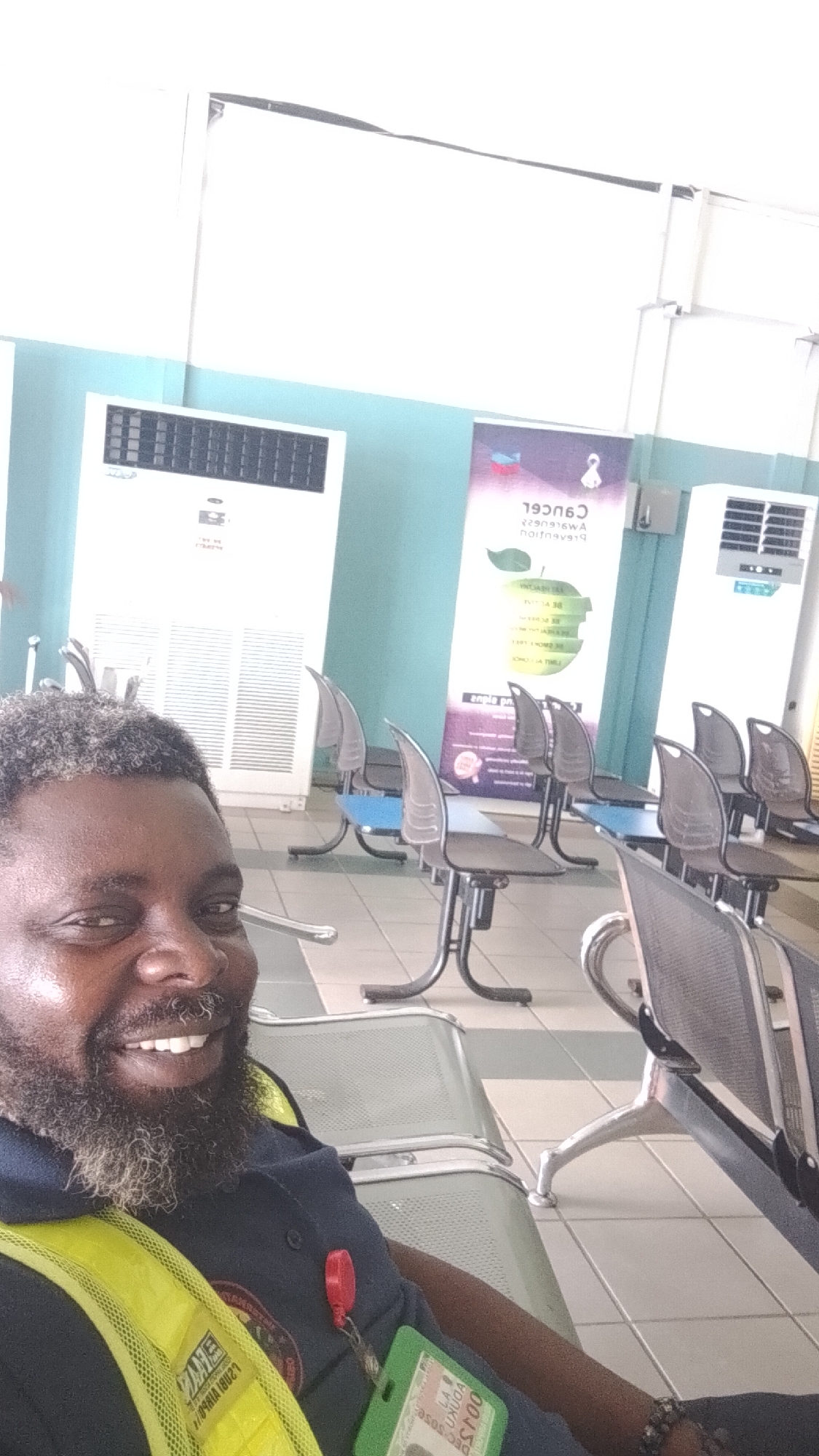 The image displays an indoor public waiting area in Orerokpe, Nigeria. In the foreground, an adult male with dark skin, a full grey-streaked beard, and grey hair is smiling directly into the camera. He is attired in a dark blue polo shirt, a yellow high-visibility vest, a red lanyard, a green identification card holder, and a beaded bracelet on his left wrist. The environment consists of light-colored tiled flooring and a wall with a light blue lower section and a white upper section. Two white, floor-standing air conditioning units are positioned against this wall, flanking a vertical banner displaying reversed text, including "CANCER Awareness Prevention," alongside associated graphics. Multiple rows of unoccupied, dark-colored, perforated metal gang chairs with silver frames are arranged in the waiting area.