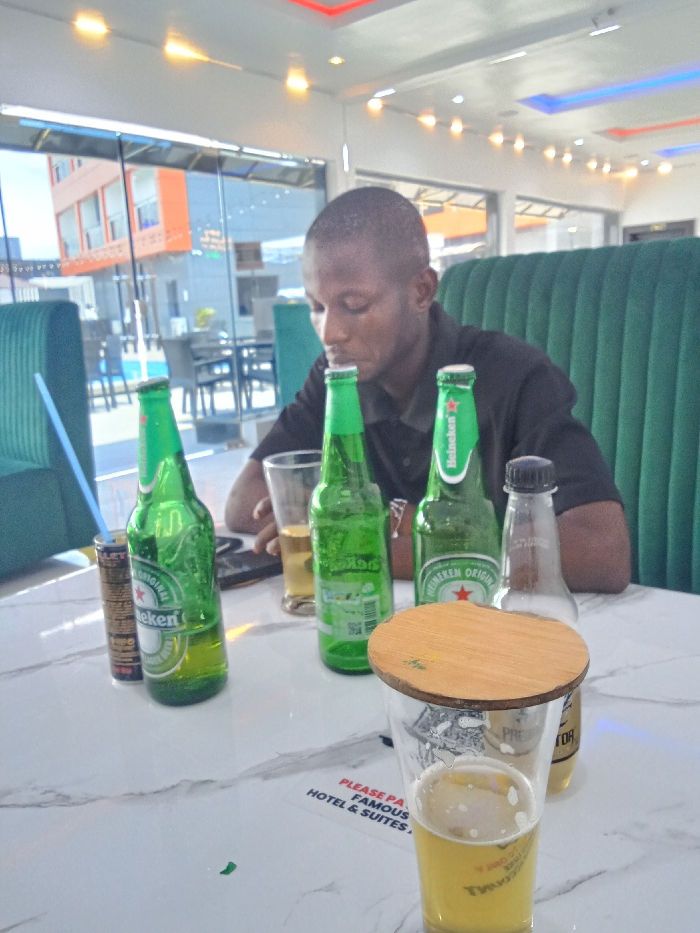 man sitting at a table in a restaurant, holding a glass of beer in his hand. There are three unopened bottles of beer on the table, one of which is a Heineken, and a glass of what appears to be a soft drink on the table. The man is wearing a black T-shirt and his head is bowed. The table is made of white marble. The restaurant is bright and modern, with large windows and a green booth behind the man. The location is in Ujevwu, Nigeria, at the coordinates 5.472 latitude, 5.818 longitude. There is a sign on the table that reads "Please patronize Famous Hotel & Suites." The man is seated alone, looking at something on the table.