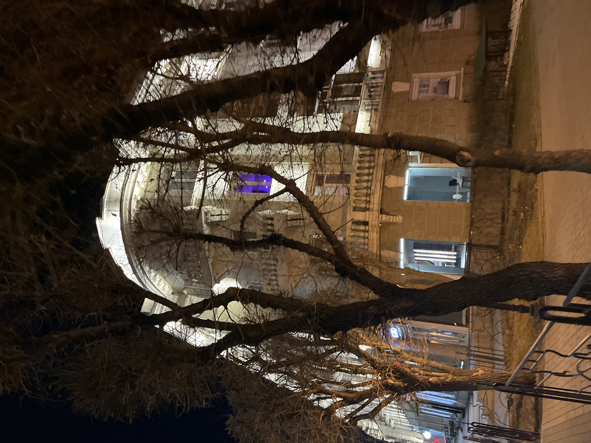 view of a building at night, partially obscured by tree branches. The building features a rounded facade and windows, with some illuminated. The exterior walls appear to be stone or concrete. The tree branches are bare, suggesting it may be winter. The environment is urban, as indicated by the building and surrounding structures. The location is Unknown, Unknown.