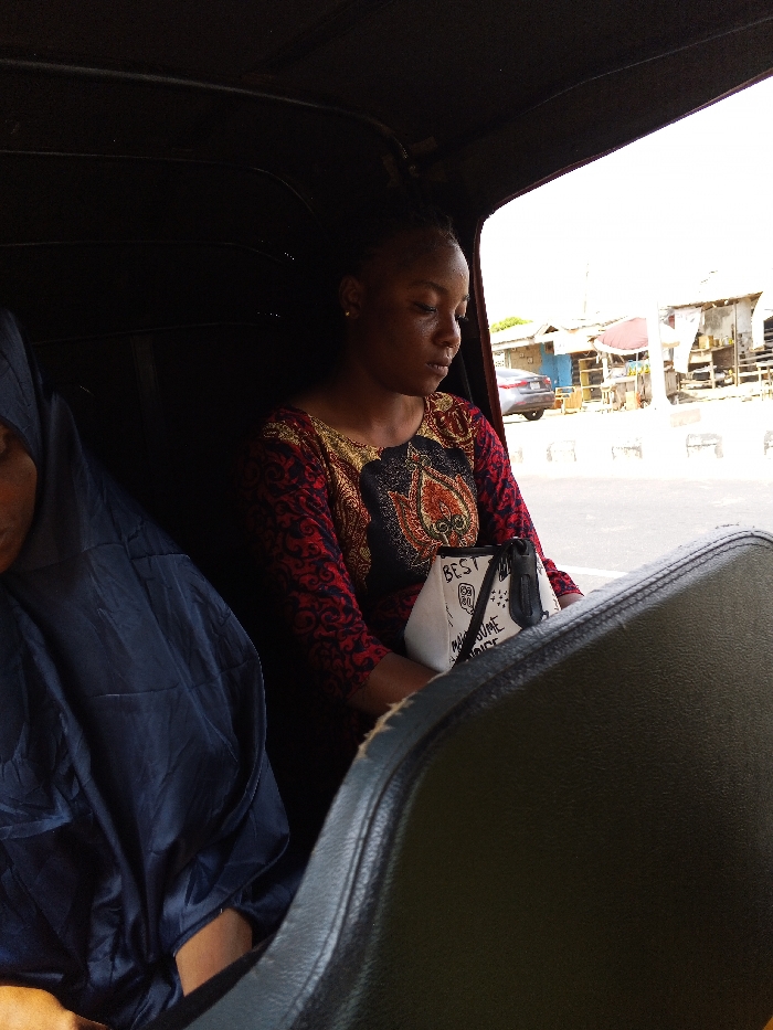 The image displays the interior of a passenger vehicle, likely a motorized tricycle, in Zango-ndaji, Nigeria, with a view through the open side to the exterior street scene