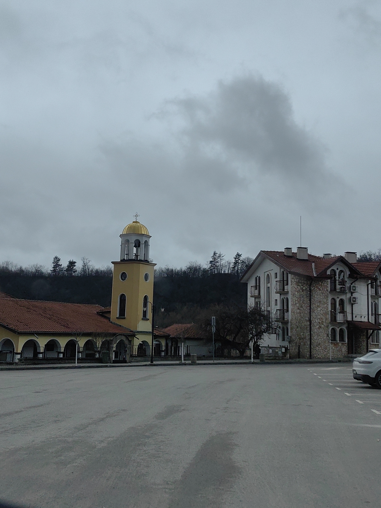The image depicts a square in Mirkovo, Bulgaria on a cloudy day. A white vehicle is parked in a parking space in the foreground. To the left, there's a building complex featuring a yellow bell tower with a golden dome topped with a cross. The roof of the building is red tile. Adjacent to this structure is a three-story building with a mixed facade of white and stone. Trees line the horizon in the background. The square itself is paved and appears mostly empty.
