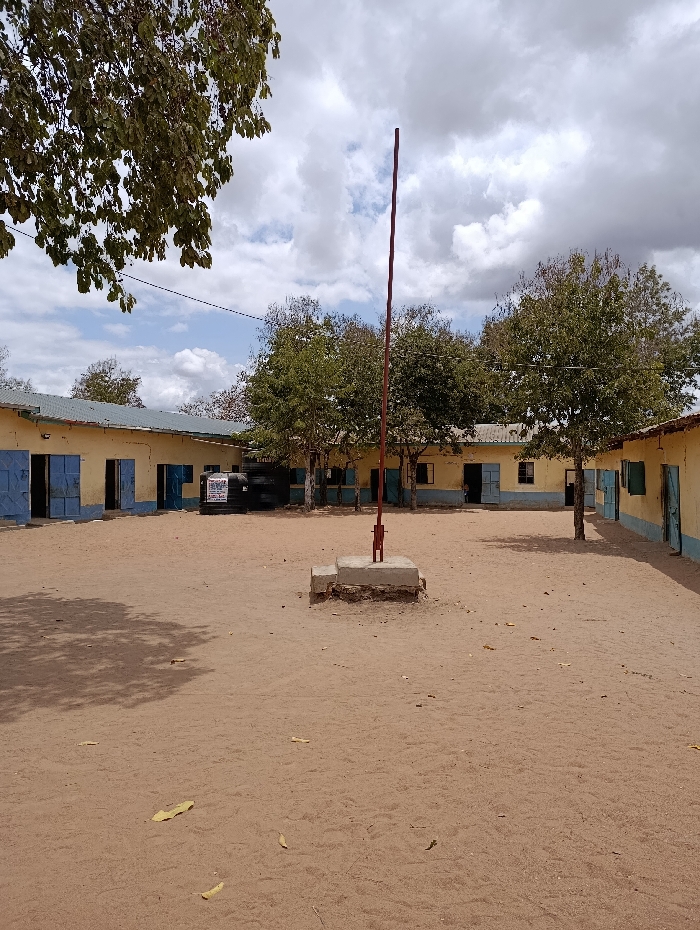 The image depicts an outdoor view of a school courtyard located in Musikio, Kenya