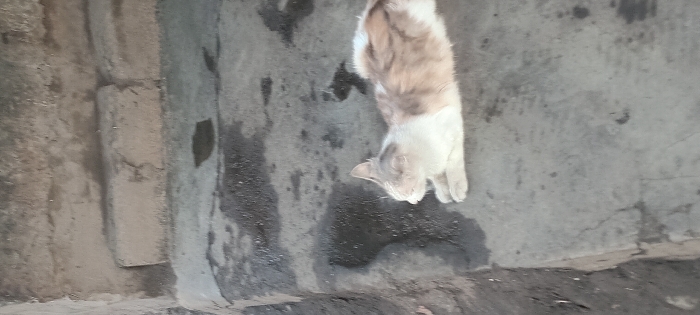 A cat with white and brown fur is resting on a concrete surface. The background features a combination of dark and light gray tones, showing an aged or weathered appearance. Darker patches appear on the concrete, contrasting with the lighter areas around the edges and to the right of the cat. A vertical concrete element is visible on the left.