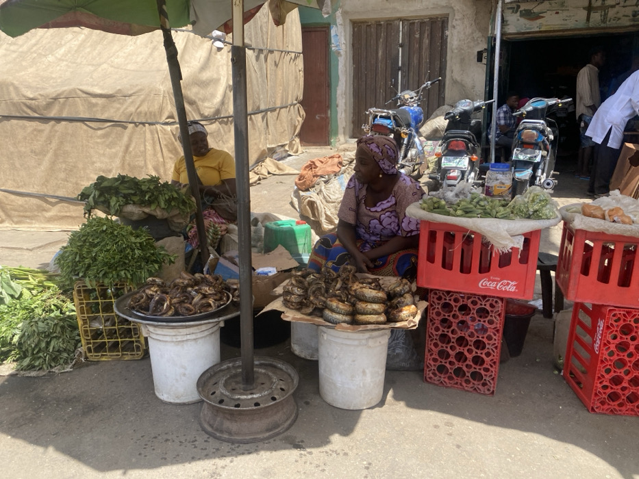 An outdoor market scene in Maiburiji, Nigeria, is depicted under bright daylight, featuring vendors and their merchandise