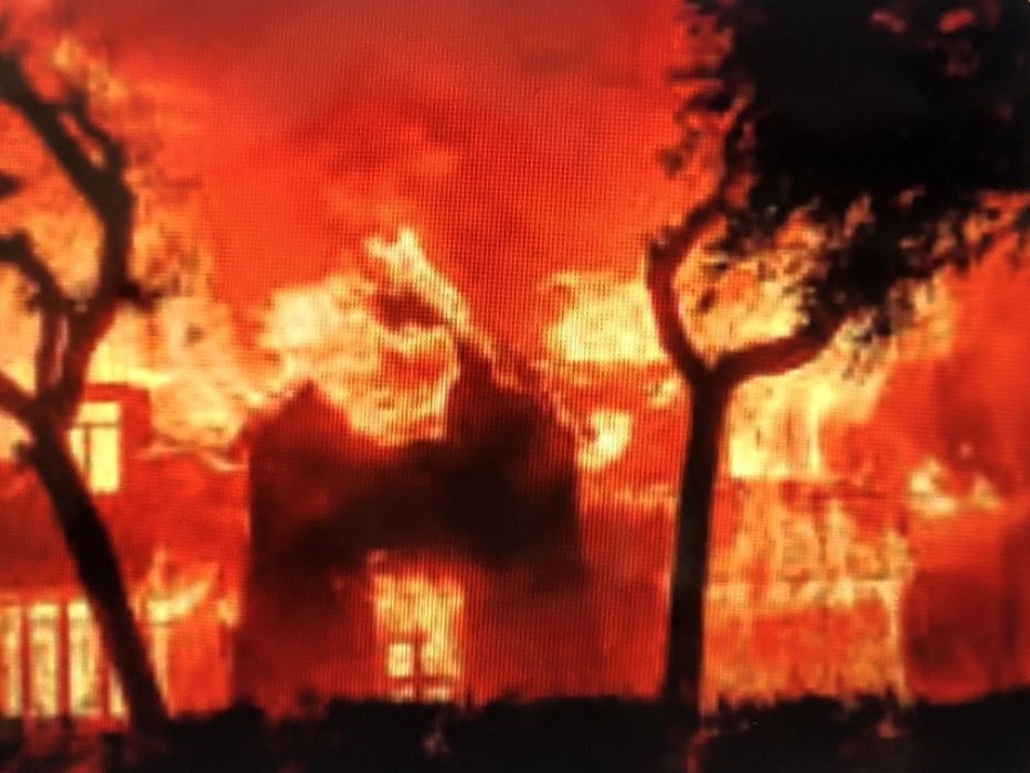 The image depicts an intense fire in an outdoor urban or semi-urban environment within the Kafr Sousa Municipality, Syria