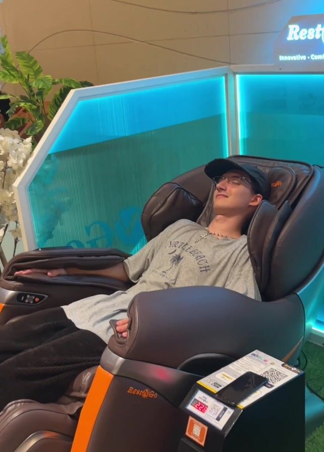 Two people relax in brown and orange massage chairs. The chairs are located in a store or mall setting with blue translucent partitions and artificial greenery visible. The first person is a young man wearing a hat, glasses, and a t-shirt, lying back in the chair. The second person, wearing glasses and a striped shirt, also relaxes in a similar chair. Both chairs have payment kiosks attached to them.