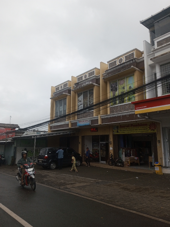 A street scene reveals a row of two-story buildings, the center ones painted a tan color with decorative stone accents