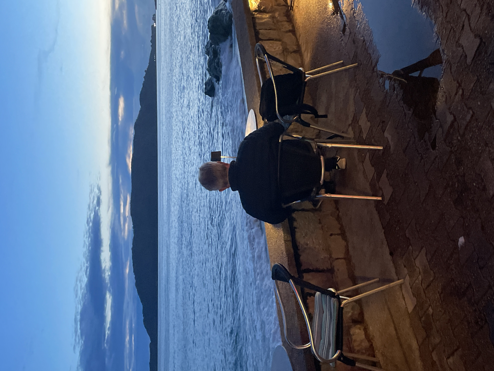 A male individual is observed from the rear, seated at a small, round white table on a paved terrace in Rafailovići, Montenegro, facing the Adriatic Sea at dusk. He wears a dark jacket and light-colored sneakers. An illuminated electronic device stands upright on the table in front of him. He occupies a dark-framed chair; another similar chair to his right holds a dark bag on its backrest, and a third unoccupied chair with a striped fabric seat is to his left. A low, light-colored stone wall separates the terrace from the dark blue sea, where white-foamed waves break against the shore. Dark rocky formations are visible in the water on the right. The ground is paved with dark reddish-brown interlocking pavers, illuminated by a warm yellow light originating from the wall, and contains multiple puddles reflecting the dim sky. A dark, silhouetted landmass extends across the distant horizon under a dark blue twilight sky with horizontal cloud formations and faint lighter streaks near the horizon. Distant artificial lights are visible on the far right of the distant landmass.