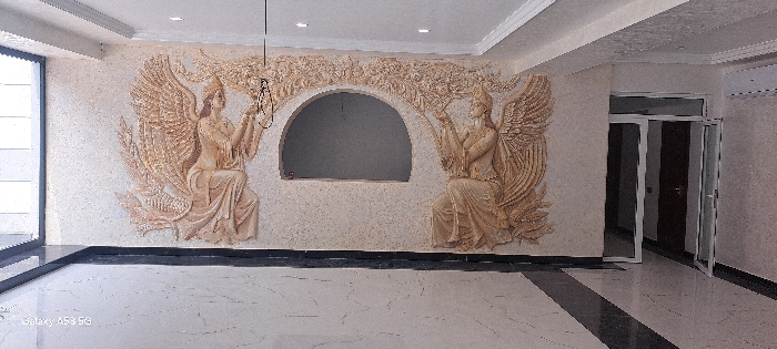 The image displays an interior view of a wide, well-lit hall or lobby in the city of Unknown, Unknown. The prominent feature is a large, light-beige bas-relief sculpture covering a textured wall. This sculpture depicts two symmetrical, winged female figures, seated and facing inwards, each adorned in flowing drapery. The figure on the left appears to hold an indistinct object with raised hands, while the figure on the right holds an object resembling a harp. Between these figures is a central arched niche with a low, flat sill. Elaborate botanical or vine-like carvings extend above and around the arch, connecting the two figures. The floor is tiled with light-colored material, segmented by dark grey or black strip borders. To the far left, a tall glass panel or door with a dark frame extends vertically. To the right, a white-framed glass double door, with one leaf partially ajar, reveals a dark interior doorway. The white ceiling contains multiple recessed circular lights and a linear fluorescent fixture near the left wall. A thin dark wire or cable hangs from the ceiling above the central arch. An air conditioning unit is mounted high on the right wall. No individuals are present in the scene.