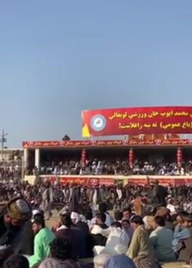 large crowd of people at an outdoor event. Many people are seated on the ground, while others are standing and walking around. A few men in traditional clothing are at the forefront. There is a large banner in the background with text in a different language. The sky is clear and blue. A man in a light blue robe walks in the foreground towards the camera. The location appears to be a stadium or open-air venue with tiered seating. The crowd appears to be watching a sport or a performance.