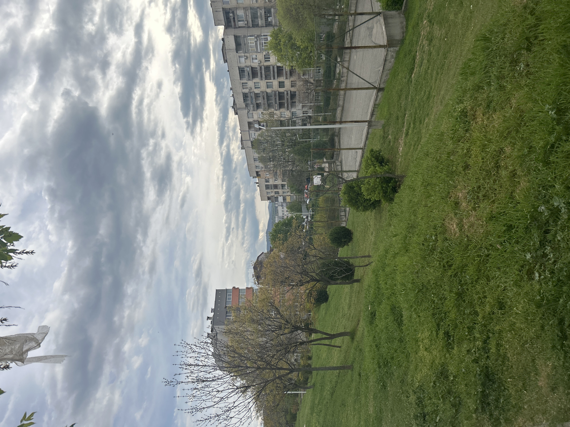 cityscape scene under a cloudy sky. The view includes residential buildings, green grass, and trees. The photograph seems to be taken in Blagoevgrad, Bulgaria, based on the style of architecture of the apartment buildings. A basketball court is visible between the buildings and the grassy area.
