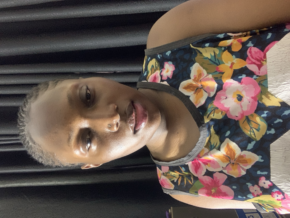 A head-and-shoulders portrait features an individual with dark skin, facing directly towards the camera. The subject has dark hair, styled close to the scalp, and a small silver-colored stud piercing is visible on the left nostril. Their lips are slightly parted. The individual is wearing a sleeveless top with a dark background featuring a vibrant floral pattern in shades of pink, yellow, orange, and white, interspersed with green and blue leaf motifs. The neckline and armholes are trimmed in gray. A partial white graphic is visible on the lower portion of the shirt. The background consists of dark, vertically pleated fabric, appearing to be curtains. On the far left, a faint, out-of-focus light-colored object, possibly a box, is partially discernible. The image provides no visual evidence to confirm the location as the city of Rafin Bauna, Nigeria.