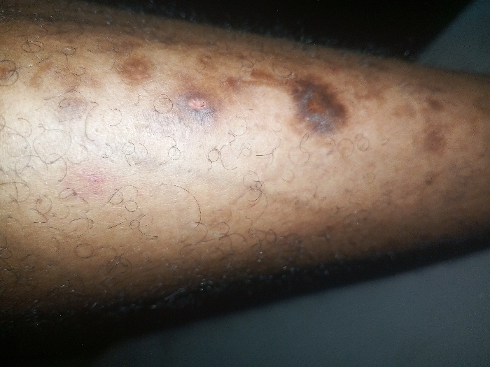 The image presents a close-up forensic view of human skin, consistent with an extremity, situated in the city of Unknown, Unknown. The skin exhibits a medium to dark brown pigmentation with scattered, dark, curly hairs. Numerous dermatological features are present: A prominent erythematous papule, approximately 2-3 mm in diameter, is visible in the mid-left region. Immediately to its right and slightly superior, a raised, purplish-brown lesion, roughly 4-5 mm in diameter, displays a central depression or crust. Multiple irregular hyperpigmented macules and patches, varying from several millimeters to over a centimeter in size, are distributed across the surface, with a notably larger, dark brown, ill-defined patch observed in the superior right quadrant. Some hair follicles are distinct, and several hairs appear to be embedded within the epidermis. The immediate background is uniformly dark, indicating a focused perspective on the skin surface.