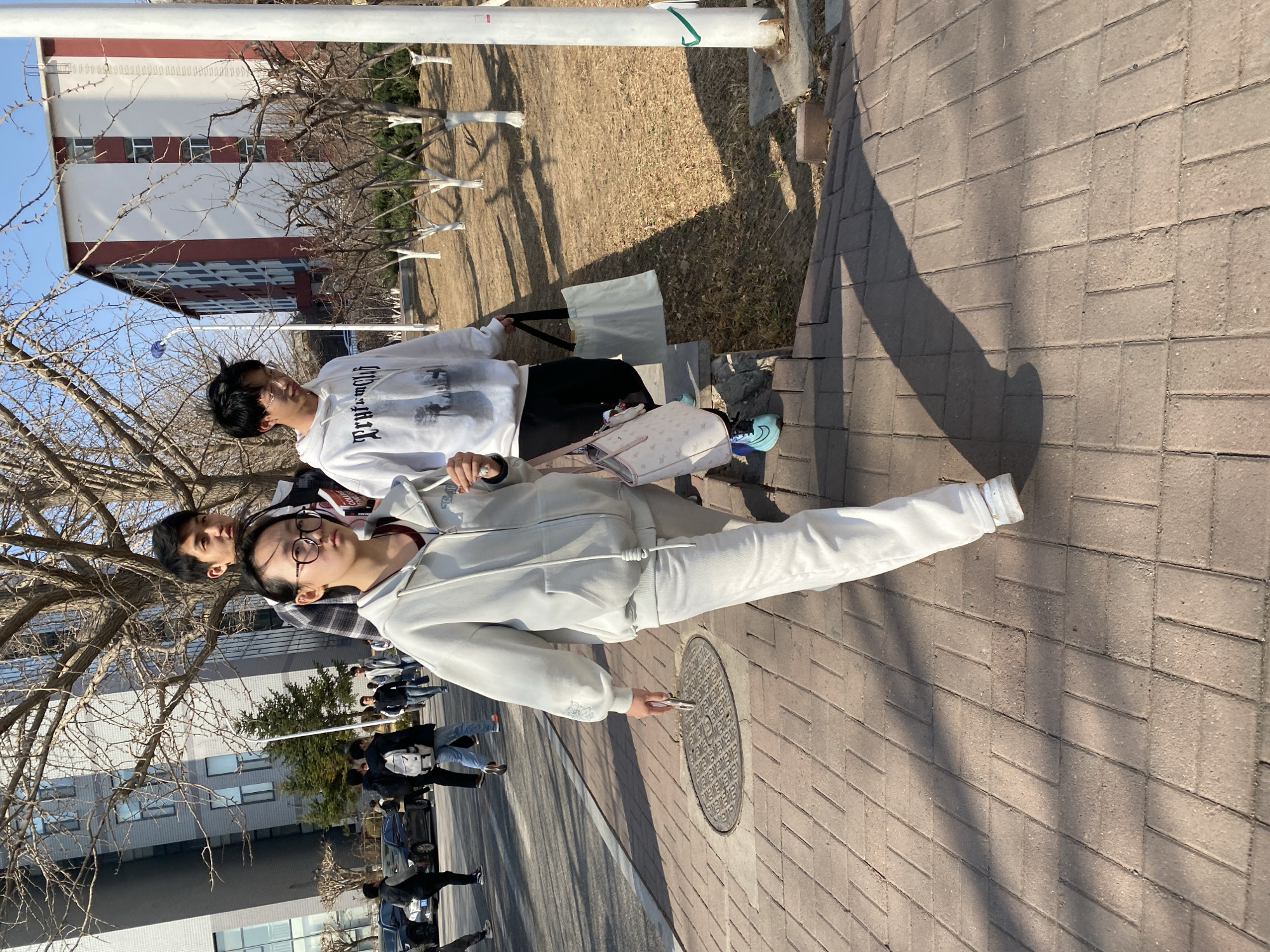 group of people walking on a brick-paved walkway in an outdoor environment. One person wearing glasses and an all-white outfit is in the foreground, holding what appears to be a phone. Other people are walking in the background. The location appears to be an urban area, with buildings and bare trees visible. The presence of numerous other individuals suggests a relatively crowded or public space. This is the city of Zhongtun, China.