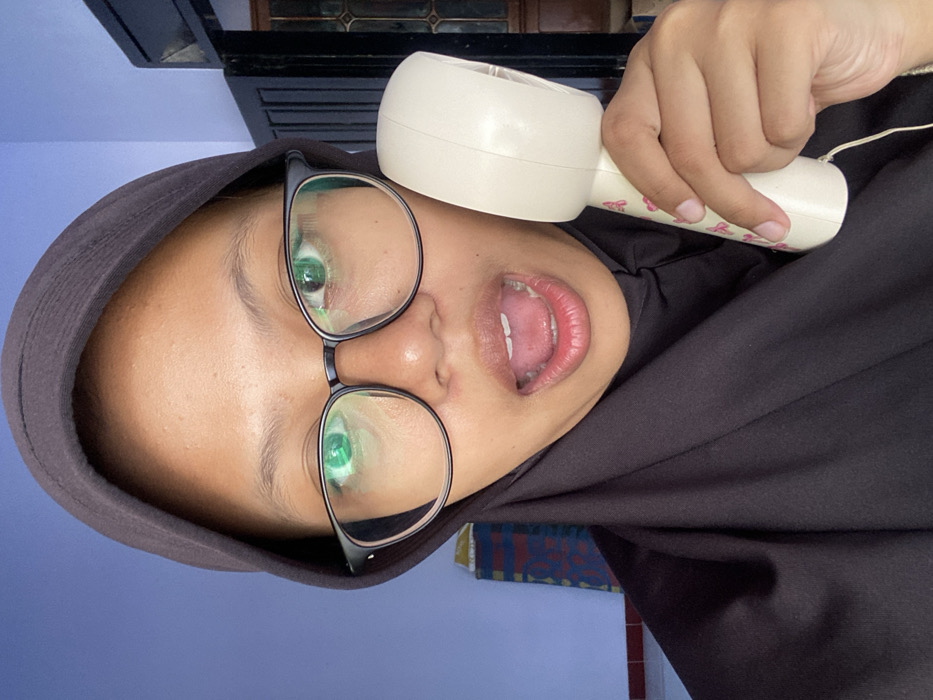 A person wearing glasses and a hijab is holding a vintage rotary phone receiver to their head. They are looking directly at the camera with an open mouth, possibly sticking out their tongue. The background includes a blue wall and a glimpse of a patterned textile. The image appears to be rotated counterclockwise.