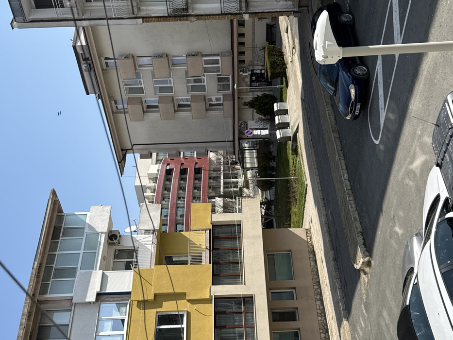 The image depicts an urban scene in Nesebar, Bulgaria, under a clear blue sky with two small, dark aerial objects visible. The foreground features a light-colored paved area with three partially visible vehicles; a silver car, a white car, and a dark vehicle with roof rails. A dark blue Ford Mondeo station wagon (Bulgarian license plate CB 6000 ES) is positioned in the midground, parked on asphalt marked with white lines, near a curb. On the left, a multi-story building displays a facade of white and yellow sections, featuring numerous windows, some enclosed balconies, an external air conditioning unit, and a satellite dish. To the right, another multi-story building, light beige in color, presents multiple small, open balconies with vertical rails. In the background, between these two structures, a modern building with curved red facades and balconies is visible. At ground level, a sidewalk runs parallel to a grassy median strip with sparse vegetation. Three metallic refuse bins are situated on a concrete slab near the curb, adjacent to a "No Parking" sign (red circle with diagonal line). No individuals are present in the scene. A white pole with a curved, light-colored fixture extends into the lower right portion of the frame. Overhead wires traverse the upper half of the image.