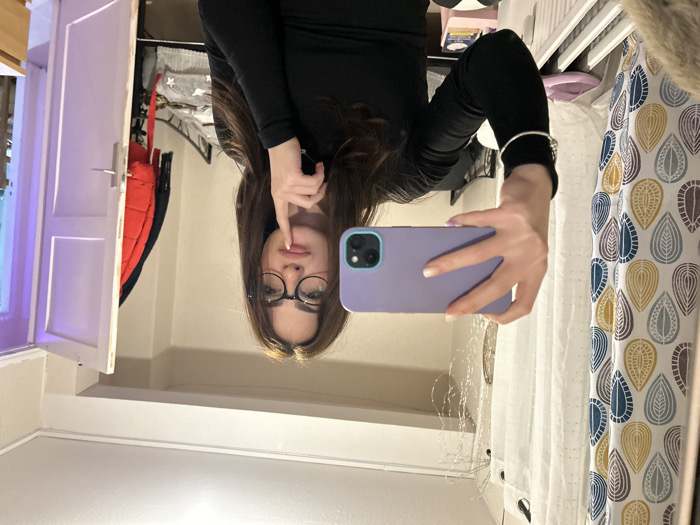 - "A woman in a black long-sleeved shirt and black-framed glasses poses in a mirror selfie, holding a lavender iPhone" by FM-vVQbp1, licensed under CC BY 4.0