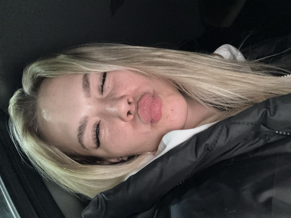 A young woman with blonde hair poses with pursed lips. Her eyes are closed. She is wearing a white top underneath a black puffer jacket. She appears to be indoors, possibly in a car, as dark interior elements are visible in the background. The image is taken at an angle, adding a casual, informal feel.