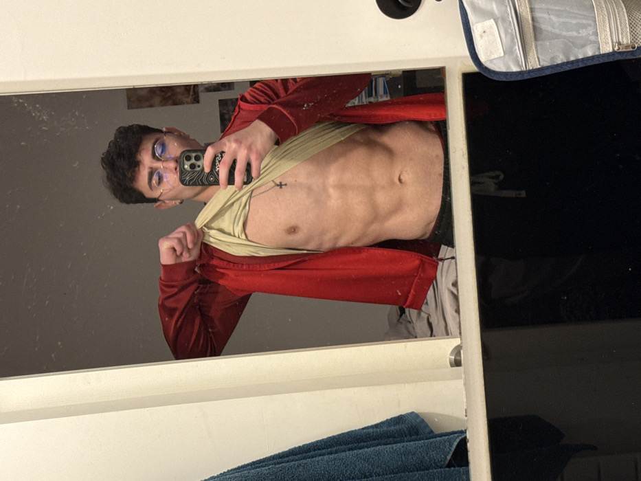 A young man with dark curly hair and glasses takes a selfie in a mirror. He is lifting up his tan t-shirt to reveal his toned abdomen. He wears a red track jacket and a delicate necklace with a cross pendant. The mirror reflects a bathroom setting with a blue towel hanging below and a glimpse of a toiletry bag on the top right corner. The phone case features a topographic design.