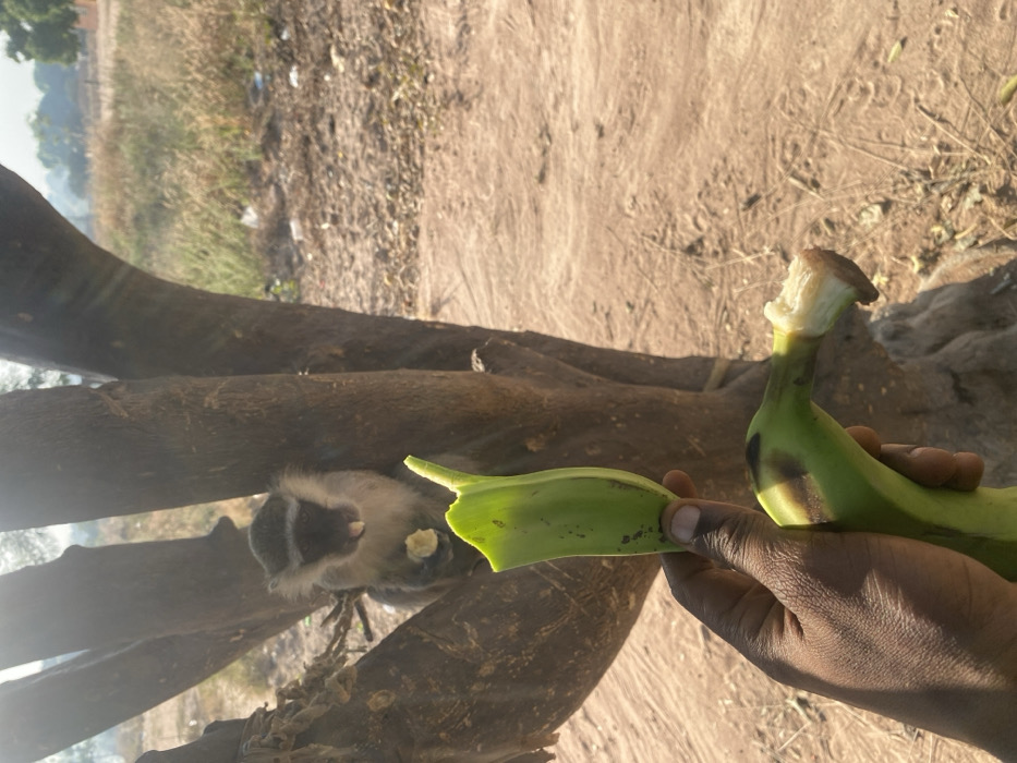 A person’s hand holds two green plantains outdoors. One plantain has a bite taken out of it. A monkey is in the background, positioned within the branches of a large tree, and appears to be consuming a piece of food. The ground is visible in the background, along with some vegetation. The lighting suggests it is daytime, possibly late morning or early afternoon.