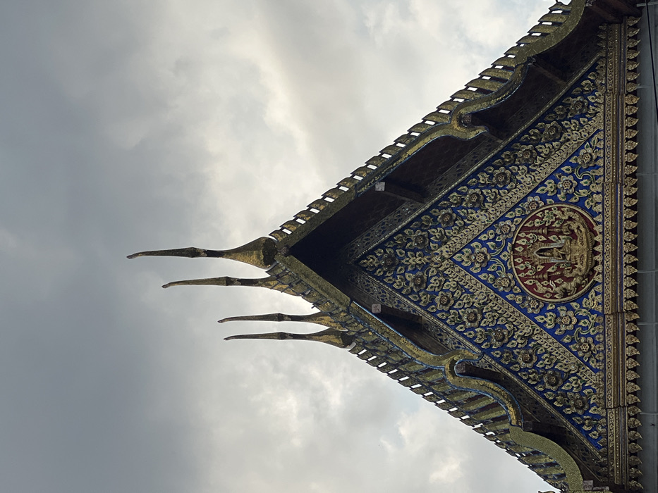 The image displays the upper portion of a highly ornate religious building, identified as a Buddhist temple in Bangkok, Thailand. The central focus is the triangular gable, intricately decorated with gilded relief work featuring stylized floral and foliate motifs on a deep blue background. A prominent circular medallion, colored red and gold, is centered within the gable, depicting a seated figure, likely a deity or Buddha, surrounded by a tiered, architectural golden frame and additional ornate elements. Above the gable, the roof structure is visible, characterized by multiple tiers and four prominent, upward-curving, pointed golden finials along its ridge, which exhibit signs of weathering or patina. The entire structure is viewed against an overcast sky with varying shades of grey clouds. No individuals, actions, or interactions are visible.