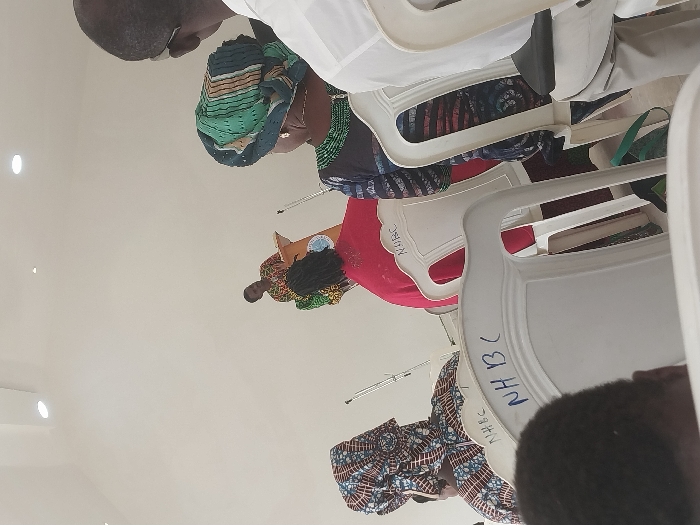 The image captures an indoor event, likely a service or meeting, within a well-lit room featuring light-colored walls and recessed ceiling lights