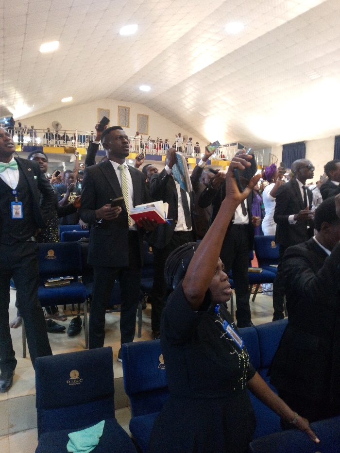 The image portrays an indoor gathering of approximately fifty individuals within a large hall in the city of Television, Nigeria. The hall features a white, vaulted, coffered ceiling equipped with recessed lighting fixtures. Light-colored walls are visible, and a balcony with a yellow railing and two rectangular decorative panels is present in the background. Rows of blue upholstered chairs with dark wooden frames are arranged throughout the space, with the inscription "D.L.G.C. KADUNA" visible on the backrests of multiple chairs. The attendees, primarily adults, are standing and oriented towards the front of the hall. Many individuals have their arms raised, and several are holding smartphones, with multiple devices extended upwards, suggesting recording or photography. Most male attendees are dressed in dark suits, white shirts, and ties of various colors (e.g., light green striped, solid black), with one male wearing a light green bow tie. ID badges on lanyards are visible on several individuals. In the central foreground, a male in a black suit and a light green patterned tie holds a black smartphone in his left hand and a stack of books, including one with a red cover, in his right hand. His head is slightly tilted upwards. To his immediate right, another male holds a blue book or binder partially in front of his face. In the right foreground, a female wearing a black dress and a black head covering has her right arm fully extended upwards, holding a black smartphone. Her facial expression indicates focused attention with an upward gaze. A light blue cloth is draped over one of the blue chairs in the lower-left portion of the frame. Black footwear is visible on the floor beneath some chairs.