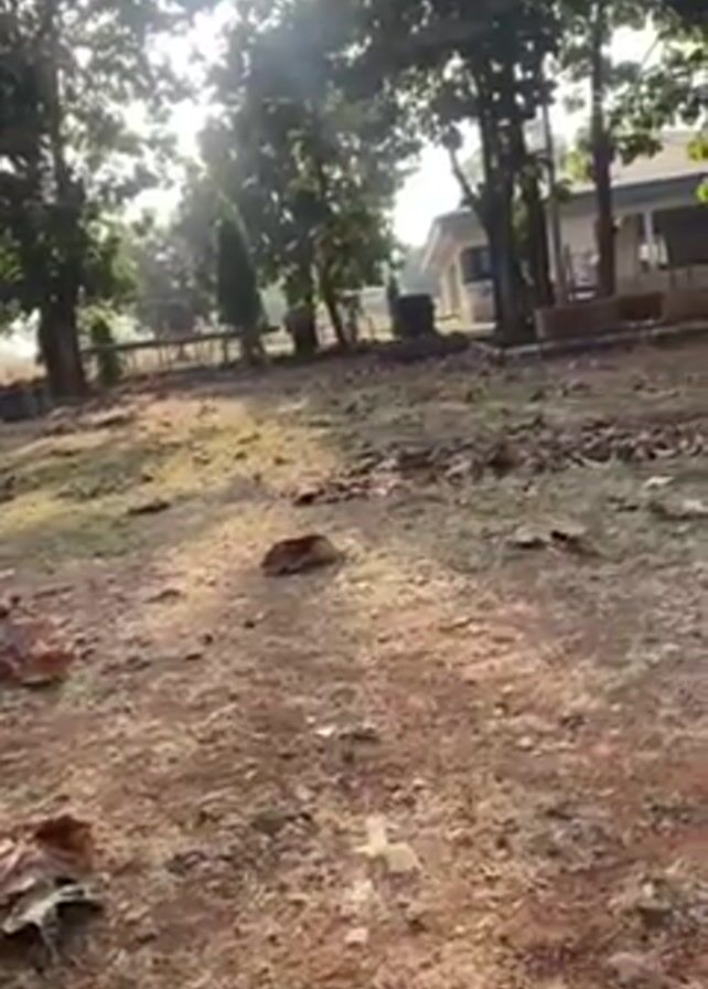 daytime outdoor scene with a dirt ground, scattered leaves, and sparse greenery. Trees surround the area, casting shadows on the ground. In the background, a building is visible with a light-colored exterior and a green roof. The sky is bright, and sunlight filters through the trees. No people or animals are visible. The camera is static, and there is no visible action besides the natural lighting and subtle movements of leaves.