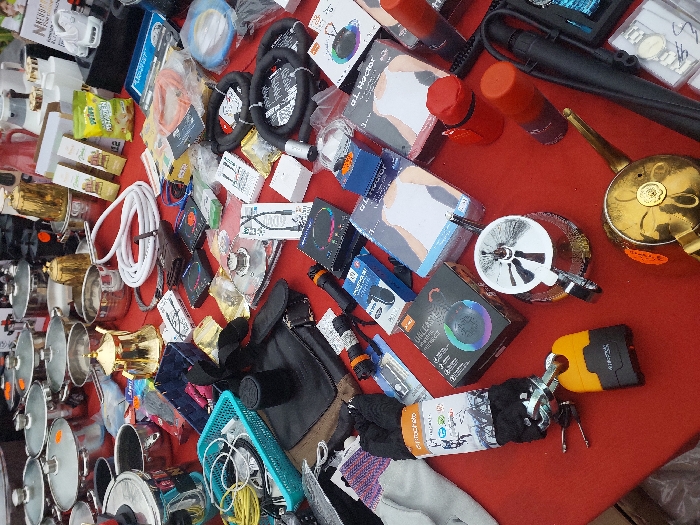 The image depicts a crowded vendor stall at a market in Eckbolsheim, France. A red tablecloth covers the display surface, upon which a diverse array of merchandise is densely arranged. In the upper-left and center, numerous stainless steel cooking pots with clear glass lids of various sizes are visible. Adjacent to these are several golden-colored, ornate teapots or decorative vessels. A white, coiled hose and other assorted cables (yellow, black) are scattered across the mid-ground. Various electronic items are present, including packaged earphones, a black portable speaker labeled "UNLEASH," and microphones. Several retail packages containing white undershirts, labeled "AL HADOR," are positioned on the right side. Black socks, branded "Trendy socks," are bundled on the lower left. A heavy-duty black chain lock with an attached yellow padlock and keys rests prominently in the lower-left quadrant. Additional objects include small white boxes, red cylindrical containers, a brown wallet, a black pouch, green bags of pistachios, and a clear glass pitcher with a metal infuser. The items are tightly packed, indicating a retail display setting. No individuals are visible in the frame.