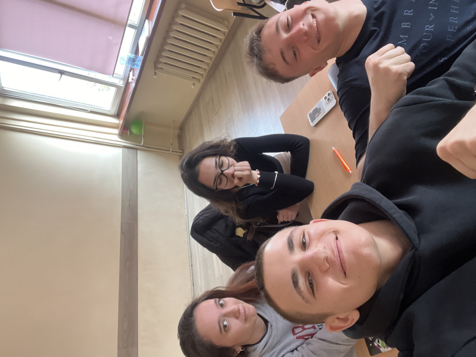 An indoor scene, likely a classroom, is depicted in a selfie-style photograph. The environment is consistent with an educational facility in Burgas, Bulgaria. Four young individuals are present: two males in the foreground and two females positioned behind them. The male on the left in the foreground has short dark hair, wears a black hoodie, and smiles directly at the camera. His left fist is visible in the lower right portion of the frame. The male on the right in the foreground has short light brown hair, wears a dark t-shirt with white text, and smiles at the camera, displaying his right fist. Behind them, a female with long dark hair, wearing a grey sweatshirt with dark lettering, looks towards the camera with a slight smile. Next to her, a second female with long dark curly hair and glasses, wearing a dark long-sleeved top, rests her chin on her right hand, looking downwards and away from the camera. A light brown desk surface is visible, upon which a white smartphone with a dark case and an orange pen are placed. A black jacket or bag is draped behind the mid-ground female on the left. The room features light beige/cream walls with a horizontal wooden protective strip. To the right, a large window with partially drawn pink roller blinds allows natural light into the space. A blue plastic bottle and a white object rest on the dark brown windowsill. Below the window is a white fluted radiator. A white, three-tiered stand with a green spherical object on its top shelf is positioned to the left of the window. The floor is light-colored, possibly laminate or wood.