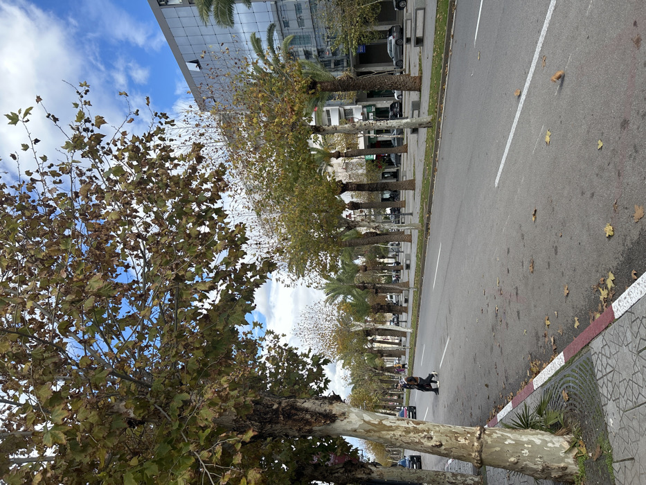 The image depicts an urban thoroughfare in the Ville Nouvelle (New City) of Fez, Morocco, under a partly cloudy blue sky. The scene shows a wide asphalt road, a central median, and buildings lining the street. In the immediate foreground on the left, the trunk and branches of a large plane tree with a mix of green and brown autumn leaves are prominent. The sidewalk on the left features patterned concrete tiles bordered by a red and white painted curb. Scattered brown and yellow leaves are visible on both the sidewalk and the asphalt road. The asphalt road, extending into the midground, has white dashed lane markings, indicating multiple lanes of traffic. Two individuals, both dressed in dark jackets and trousers, are walking across the road from left to right, approximately centrally in the frame. A wide, landscaped median separates the traffic lanes. This median is densely planted with various trees, including shorter deciduous trees with sparse yellow-green foliage and numerous tall palm trees with dark trunks. Multiple unpopulated concrete benches are positioned along this median. In the background, on the right side of the street, a modern, multi-story building with a reflective glass facade is visible. Further down the avenue, other multi-story buildings, appearing to be residential or commercial, line the street. Several vehicles, including parked cars and those in motion, are visible along the far side of the road and in the distance. The overall impression is that of a quiet day in a well-maintained urban environment during late autumn.