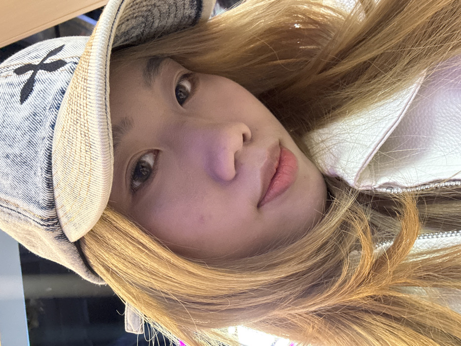 The image depicts a close-up, angled portrait of a single individual, identified as an East Asian female, located in Jiulongpo District, China. The subject faces the camera directly with a neutral expression, exhibiting slightly parted lips with a pinkish hue. She has long, layered, light brown hair. She is wearing a light-colored cap, possibly denim, with a beige brim and a dark, cross-shaped emblem on the front panel. Her attire includes a white, textured collared jacket with a visible zipper pull. The background is blurred, indicating an indoor environment with ambient artificial lighting, some of which casts a subtle purple/pink glow.